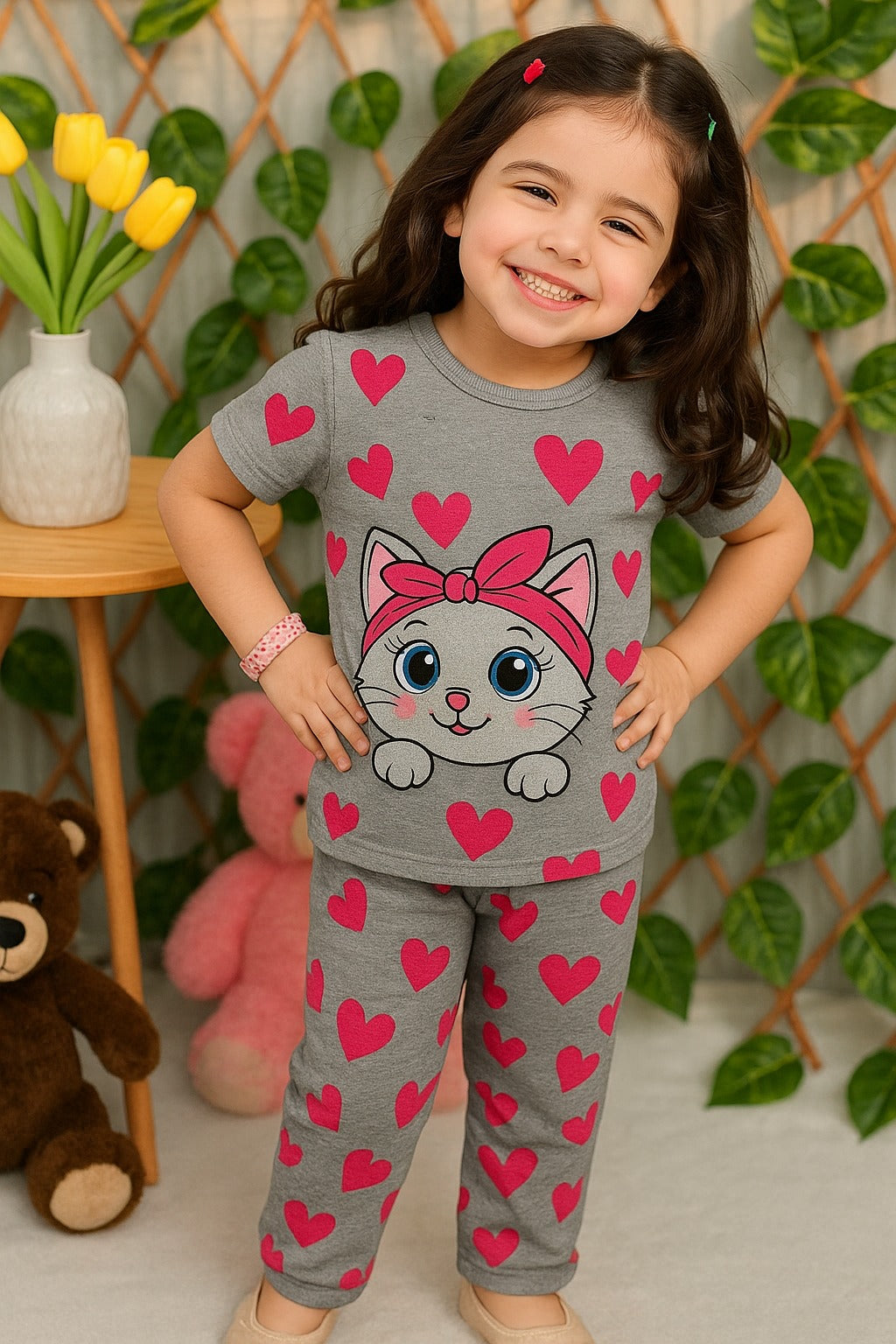Make your little girl's days brighter and cozier with this irresistibly cute Girls’ 2-Piece Loungewear Set, featuring a lovable kitten graphic and bold hot pink heart prints!