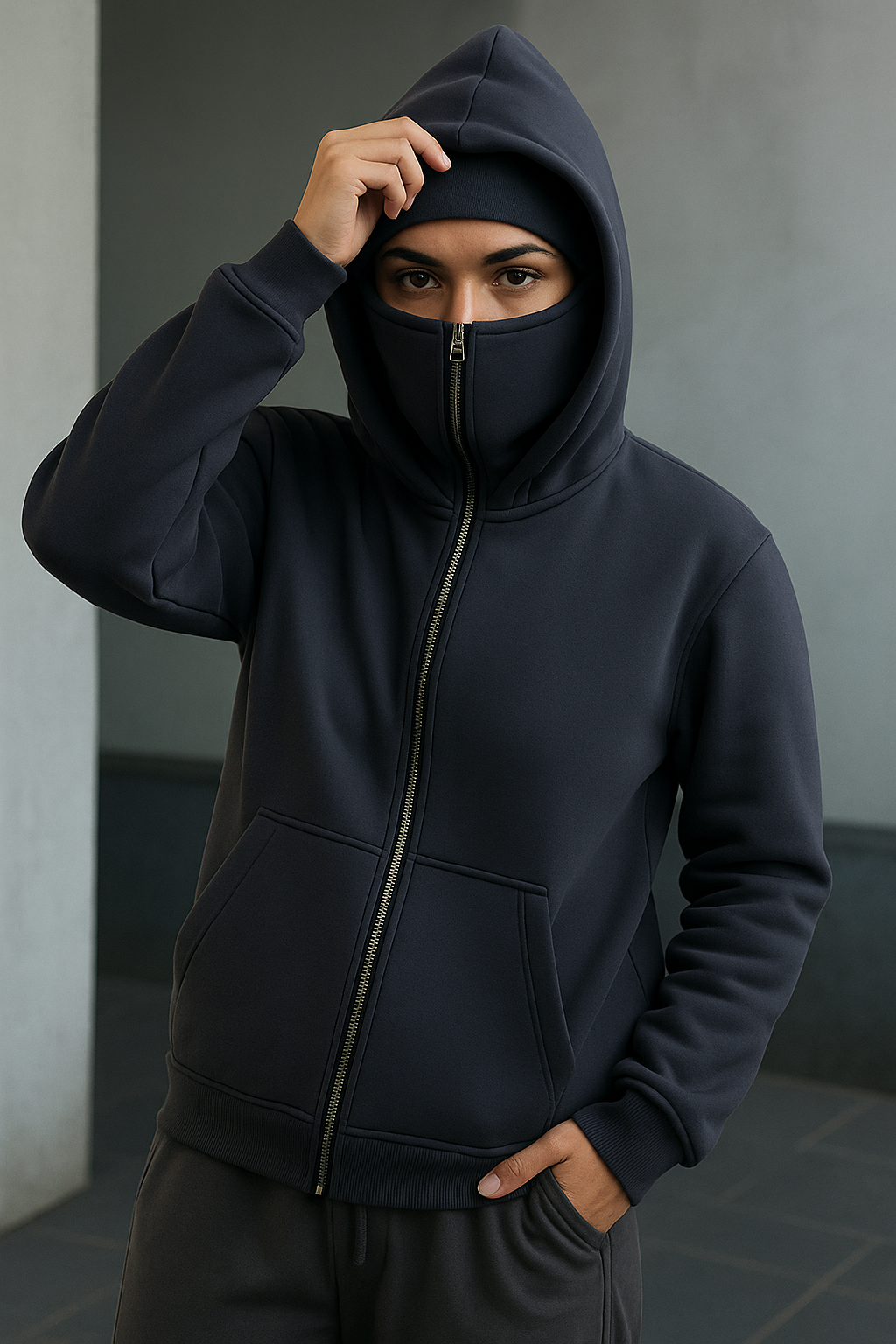 Stay warm and stylish with this sleek, dark-toned full-zip hoodie designed for modern streetwear enthusiasts. Crafted from premium, cozy fabric, it features a high-neck zip that doubles as a built-in face cover for extra warmth and an edgy look. Perfect for cool-weather outings, late-night city strolls, or casual everyday wear, this versatile piece combines comfort, functionality, and bold urban fashion in one must-have jacket.